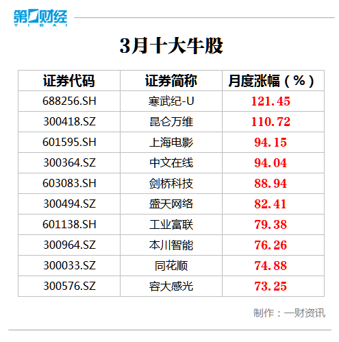 3月份,A股呈现震荡调整态势。截至3月31日收盘,上证指数月内跌0.21%,深证成指跌0.49%,创业板指跌1.22%。在剔除最近半年上市的新股后,截至3月31日收盘,3月份十大牛股平均涨幅维持在高位,其中2只牛股涨幅超过100%,涨幅最小的容大感光亦有超过70%的涨幅。