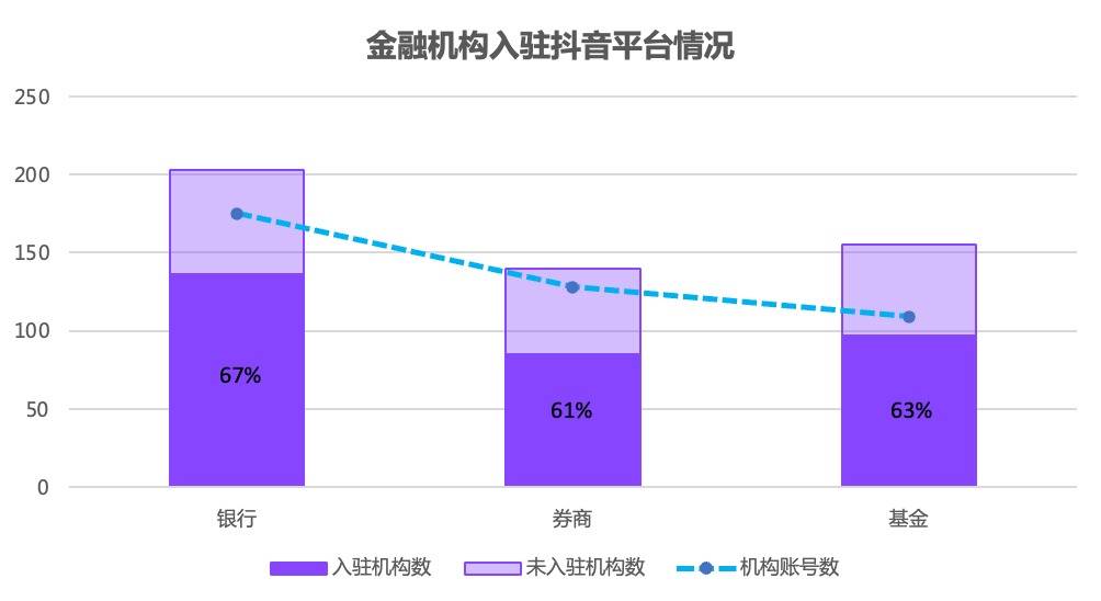 据Yiwealth研究院最新数据,以抖音平台为例,截至2023年2月底,共有136家银行(机构总数203家)开设175个账号,85家券商(机构总数140家)开设128个账号,97家基金(机构总数155家)开设109个账号,入驻率分别为67%、61%、63%。