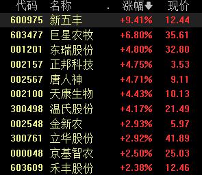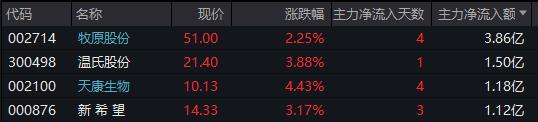 截至发稿,主力资金净流入农林牧渔板块13亿元,其中,牧原股份获主力净流入3.86亿元,温氏股份、天康生物、新希望均获主力加仓超1亿元。