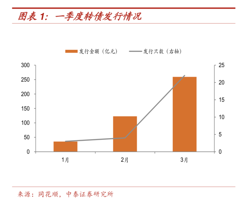 从发行规模上看,中泰证券研报指出,一季度小盘转债占比较高。发行新券中规模在30亿元以上的有2只,分别是“天23转债”和“山路转债”;发行规模在10亿~30亿元的有8只;发行规模在10亿元以下的小盘转债居多,有19只。