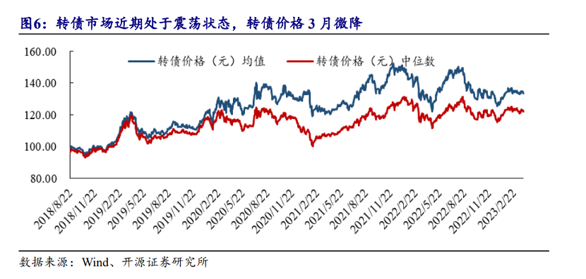 从转债需求端来看,根据开源证券研报统计,2023年以来,券商资管转债持仓占比提升明显。2022年下半年开始,公募基金的转债持仓占比提升,至2023年1月末持仓占比达到历史最高,回升至28.75%,2月份持仓占比小幅下降,但仍然保持较高水平。2023年以来,券商资管转债持仓占比提升明显,2月末占比 4.56%,已达2021年8月份以来的持仓高位。