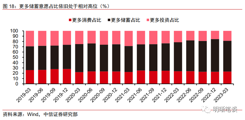 居民端扩表意愿有限。2022年四季度至今,随着防疫优化措施落地以及第二支箭、金融16条等宽信用工具部署,企业部门经营生产预期好转而信贷需求快速增长。与之相对,尽管2022年全年5年期LPR下调3次,地方“一城一策”宽地产工具频出,年底首套房房贷利率动态调整机制落地,但居民端中长贷需求持续结构性偏弱,信贷修复呈现企业强、居民弱的格局。防疫优化措施落地后出行限制解除,企业经营恢复常态,但疫情期间居民面临的失业、收入减少等问题具备长尾影响,并没有随着疫情冲击消退而结束。央行公布的一季度城镇储户问卷调查显示“更多储蓄意愿”占比仍然处于近几年的相对高位,可见在未来收入预期不稳的环境下,居民预防性储蓄心态的粘性较强,而杠杆意愿延续偏弱。