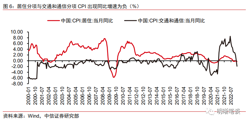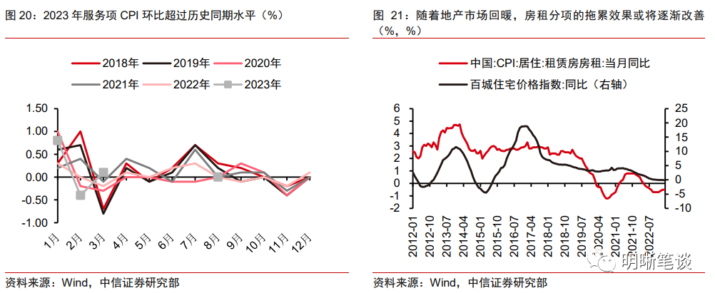 服务项的拖累效果逐渐淡化。2023年1~2月是经济修复较快的阶段,但是服务项CPI环比始终是近年来最低水平,背后是居民消费需求的恢复仍然偏慢。但是3月份服务项CPI环比反季节性回升,并创下近年来最高涨幅,背后也反映了服务需求正逐步回暖,随着5月假期以及后续暑假逐步临近,料将呈现服务需求回暖、服务项CPI环比走高的趋势。另一方面,对CPI持续拖累的租房项目,历史上于房价走势趋同,随着房地产市场的回暖,房租项CPI的拖累效果或将逐渐淡化。
