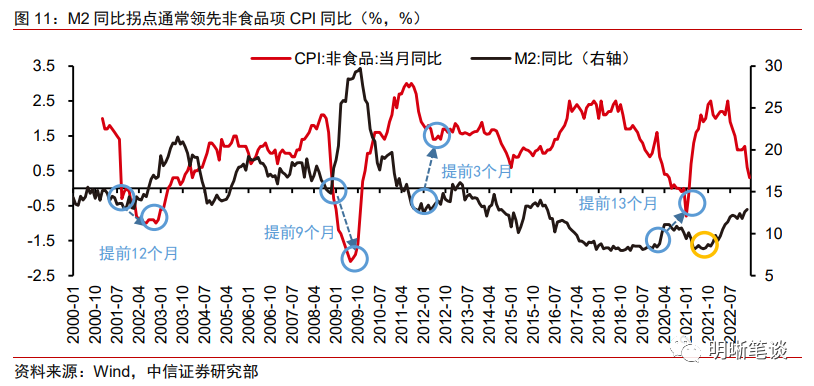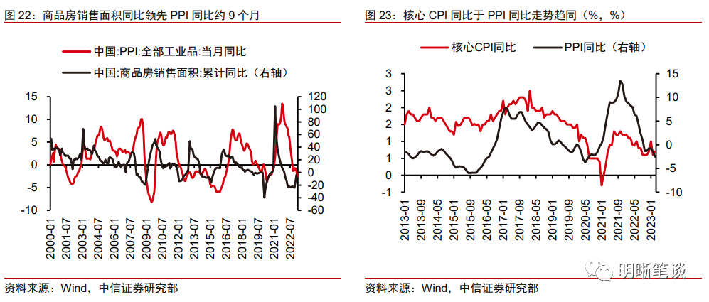 核心通胀和PPI同比或已经接近底部。从历史上看,商品房销售面积同比领先PPI同比约9个月,本轮商品房销售面积同比于2022年5月触底,对应本轮PPI同比下行趋势或将于2023年一季度前后迎来拐点。如果考虑PPI同比还受制于海外经济走弱、原油价格下滑的影响,一季度后PPI同比或进入磨底阶段,进一步下行的风险逐步减小。对于核心CPI而言,随着服务需求的逐步回暖以及PPI同比的触底,核心通胀料也将进入磨底-回升通道。