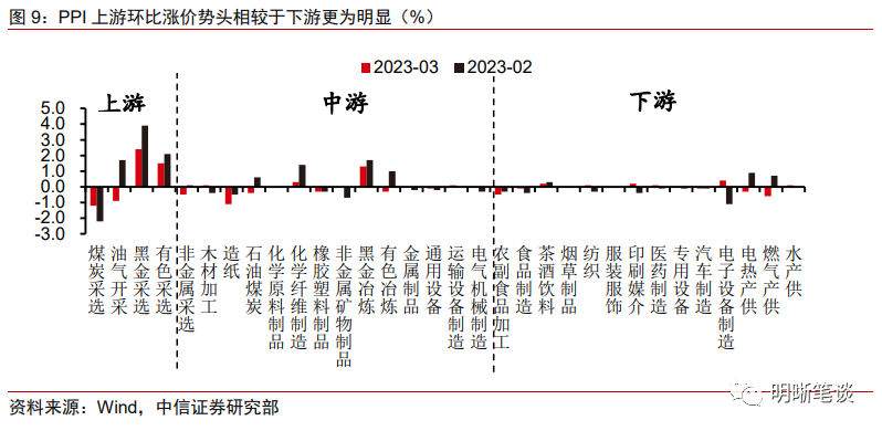 PPI上游工业品涨价势头较好,但下游需求仍未显著修复。今年来国际油价维持相对低位震荡的格局压制了我国石油相关行业的涨价动能,而供给充足叠加天气转暖,煤炭采选行业价格持续走低,但防疫优化落地、疫情冲击消退使得生产端开工情绪好转,黑金、有色等上游工业品环比持续涨价。与部分上游工业品连续涨价相对,除去电热、燃气等行业的季节性变化外,下游工业品价格环比变动幅度较小且以下行为主,指向需求端修复节奏不及供给端。
