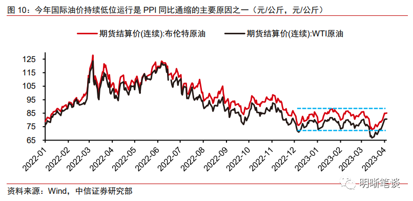 国际能源价格低位震荡叠加基数效应促使PPI同比延续通缩。2022年2月俄乌地缘政治危机激化后,由于俄乌两国均为国际能源出口大国,避险情绪抬升叠加供给受限造成原油价格大幅抬升。下半年随着市场充分price in地缘政治危机引起的风险溢价,而原油供给端压力回落,国际油价逐步下行,而进入2023年后布伦特原油期货价格基本维持在70到90美元/桶的区间震荡。除去国际油价持续低位震荡外,去年同期PPI的高基数也是今年以来PPI同比持续通缩的原因之一。