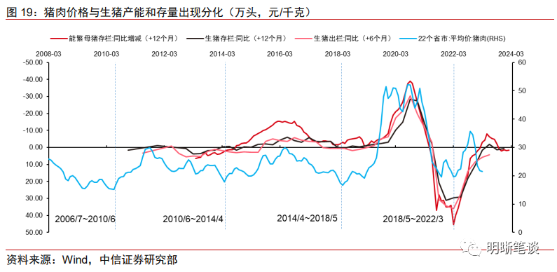 与产能走势分化,猪价后续或仍有上涨空间。2022年二季度以来新一轮猪周期启动,猪肉价格经历了一段时间的上涨后却在2022年底起持续下跌,并不符合典型猪周期的价格运行规律。在典型的猪周期中,猪周期中能繁母猪同比拐点领先猪价拐点约1年,能繁母猪存栏增速的拐点在2022年年中;典型猪周期猪价上涨阶段持续1.5年左右,当前能繁母猪产能仍然处于较低水平,猪周期尾声猪价或许仍然存在上涨空间。