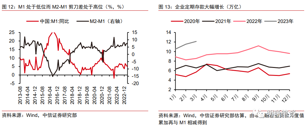 信贷投放和货币供应量大增但并未流入商品的生产消费领域。历史上M2同比拐点通常领先于非食品项CPI同比拐点3个月到1年不等,而距离M2同比上一个底部拐点已过去接近一年半的时间,非食品项CPI同比仍处于下行区间。通胀走势和M2增速、经济修复趋势背离引起市场较多关注。2021年三季度以来M2增速快速抬升,背后是宽松的货币政策基调。但是广义货币供应量增速的高涨并没有持续推动需求快速回暖,背后原因可能是因为货币并未进入到商品和服务的生产消费领域。一方面,在M2同比高增的同时,M1同比增速仍然维持低位,M2-M1剪刀差走阔,显示企业生产经济活力不高;另一方面,2022年以来企业贷款同比多增明显,对应企业定期存款大幅增长,也表明企业并没有将获得的贷款全部用到生产投资领域。