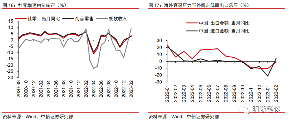 需求端修复进度偏慢且结构分化。与上游生产端较快修复节奏相对,今年下游消费需求回暖进度较慢,且呈现高端强,低端弱的结构性特征,同时海外衰退压力下外需回落压力在出口端较多显现。剔除基数效应后的社零四年年化增速为4.1%,结构上金银珠宝、烟酒、汽车等高端商品消费需求整体好于服装、家电影音、书报杂志等中低端商品需求,服务需求中餐饮、出行、旅游等接触型行业具备更高的修复弹性。内需缓慢修复的同时,海外衰退压力下外需对我国总需求修复的拖累显现,去年四季度以来我国出口金额同环比持续为负,而美联储加息周期结束前我国出口压力或难触顶。