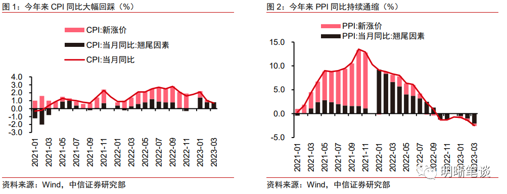 2023年来CPI同比大幅回踩,PPI同比持续通缩。2023年1到3月,CPI同比从2.1%持续下行至0.7%,3月读数大致对标2020年9月和2022年1月的低位水准,其中食品项同比从6.2%回落至2.4%,非食品项同比从1.2%下行至0.3%,核心CP同比也从1%下行至0.7%,各分项环比均在2月转负。PPI同比自从2022年10月转负后持续通缩,去年12月短暂回升后再度探底,3月-2.5%的读数为2020年7月至今的新低,生产资料价格通缩是PPI同比持续负增的主导因素;环比层面在1月短暂下行后以持平为主。总体而言,当下CPI同比回踩、PPI同比通缩的格局与2020年四季度较为类似,而当年11月与次年1月CPI同比短暂转负引起了市场对于后续通缩的担忧。