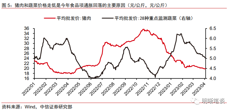 猪肉和蔬菜价格走低是今年食品项通胀回落的主要原因。观察猪肉价格历史走势,2022年4月是这一轮猪周期的起点,当时散点疫情冲击影响下,居民恐慌性囤货行为促使猪肉需求高增,叠加供给端养殖户有意压栏惜售,猪肉价格在二三季度连续抬升。随着发改委连续释放储备猪肉而供给改善,叠加防疫优化措施落地后居民囤货心理消退,去年四季度后猪肉价格迎来顶部拐点并持续走低。今年2月部分生猪养殖户有意压栏,但二次肥育导致出栏重量增加,猪肉供给较强的压力尚未减轻。蔬菜价格主要受季节性因素影响,最近一轮涨价潮出现在春节期间,而随着节日效应消退,气温回暖、应季蔬菜上市,供给改善而需求回落,蔬菜价格延续下行。