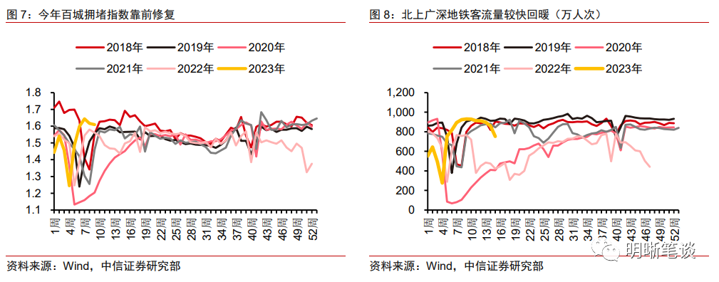 疫后消费、服务需求的缓慢修复下,非食品项、核心CPI涨价缺乏支撑。防疫优化措施落地后,线下出行、消费限制解除,叠加年初春节因素对于出行、消费和服务需求的刺激,市场对于非食品项通胀与核心通胀快速抬升存在一定担忧。然而一季度非食品项通胀环比变动幅度非常小。从百城拥堵指数以及主要城市地铁客运量来看,出行需求靠前修复,较2022年同期明显改善,但撇开今年春节时段较早的因素后,此类指标大致处于疫情前的中等水平。1到2月社零同比增速为3.5%,剔除基数效应后的四年年化增速为4.1%,体现出消费需求修复节奏中规中矩。总体而言,疫后需求端回升斜率较缓,尚不足以支撑非食品项通胀大幅抬升。