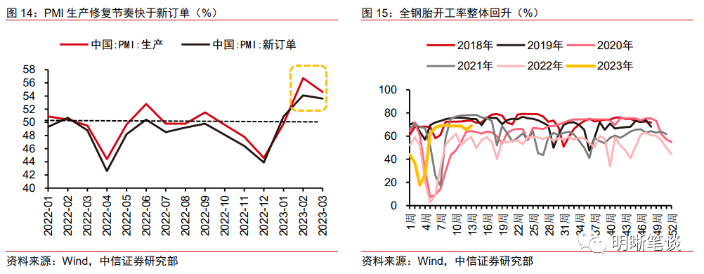 生产端回暖成色较好。今年以来PMI持续好转并进入高景气度区间,而2月后PMI生产指数持续好于新订单指数,指向经济修复呈现供大于求的格局。观察PPI各工业部门分项价格环比变化,可以发现今年以来黑色金属、有色金属、油气开采等上游工业行业存在相对明显的涨价趋势,同时全国247家高炉开工率、全钢胎和半钢胎开工率的回升态势较好,指向今年商品中上游生产端情绪修复向好。从工业生产修复的结构上看,1-2月规模以上工业增加值同比增长2.4%,两年平均增长4.9%;服务业生产指数同比增长5.5%,两年平均增长4.8%,大致对标2020年二季度、2021年三季度的水准。总体而言,2023年初防疫优化措施全面落地而疫情冲击消退,线下出行限制解除而劳动力供给恢复,生产端修复节奏偏快。