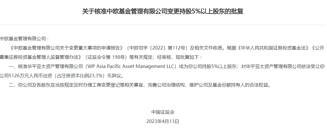 4月13日,证监会公告,核准华平亚太资产管理有限公司(WP Asia Pacific Asset Management LLC)成为中欧基金持股5%以上股东;对华平亚太资产管理有限公司依法受让中欧基金5126万元人民币出资(占注册资本比例23.3%)无异议。