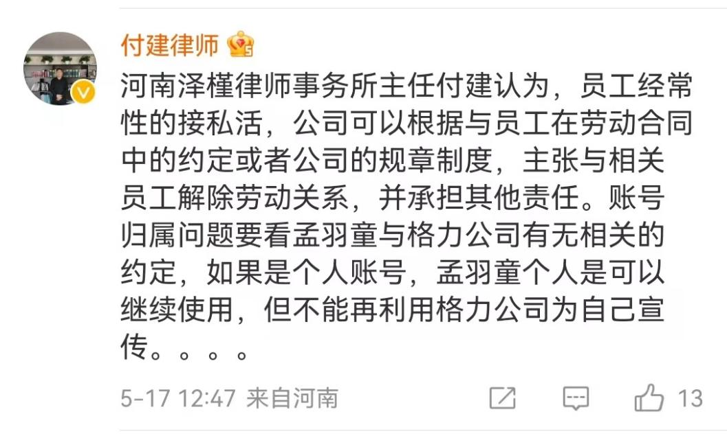 尽管格力没有正面回应孟羽童是否因接私活被开除,但关于“孟羽童接私活收入是否需要分给格力”的话题一度冲上热搜。