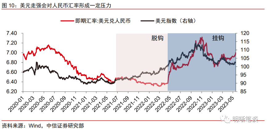 近期美国银行业风波与债务危机愈演愈烈导致市场避险情绪升温,叠加长期通胀预期意外上升导致市场降息预期回调,因而近期美元指数走强,进而人民币汇率一定程度有所承压。同时,国内经济复苏节奏不及预期,经济基本面对人民币的支撑走弱。但中长期而言预计美元整体将偏弱势运行,汇率或回归震荡市。