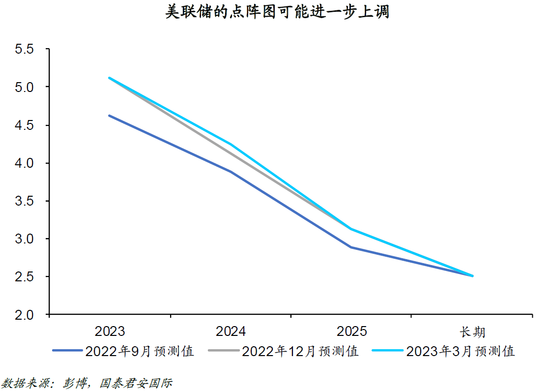 第二,本月的经济预测大概率会作出以下几个调整:第一,美联储可能调高今年的经济预测,但调低明年的经济预测;第二,美联储可能会同时调高今年和明年的核心PCE价格指数预测;第三,美联储可能会调低今年的失业率预测,但维持明年的失业率预测水平。由于经济预测是每季度作出,因此本月的新预测也会给市场一定的前瞻性指引。调高2023年的经济预测是基于目前整体经济运行态势好于预期,但调低2024年的经济预测则是考虑到利率长期处于高位可能带来的对于经济的负面影响。从通胀角度来看,核心PCE价格指数一直居高不下,并表现出“粘性”,因此三月作出的预测值明显偏低。由于通胀中枢抬升,美联储大概率需要调整未来一段时间的通胀预测,以反映出其对于中期通胀仍将保持“粘性”的基本判断。从就业市场而言,美联储在3月给出的全年失业率判断是4.5%,这与目前大约3.7%的实际值差距仍然较大,因此大概率会作一个“技术性”调整,但保持明年失业率预测不变,符合对于经济和通胀走势的基本判断。市场较为关心的“点阵图”大概率也会被上调,3月份给出的2023年的“终点利率”判断为5.0%-5.25%,中值为5.1%。基于上述一系列的预测调整,中值可能会上调至5.2%或者略高,这也意味着未来仍然会有加息的空间,但这种空间更大可能是“预防性”的。