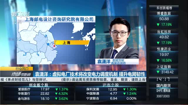 今天,电力板块大涨,智能电网投资再次引发关注。未来,虚拟电厂如何应对电网调峰调频的需求?如何提升配网智能化以提高能源消纳效率?上海邮电设计咨询研究院有限公司,数赋双碳首席咨询师袁潇洋认为,虚拟电厂将转变电力调度的机制从而提升电网韧性。此外,袁潇洋认为,AI技术在“源网荷储”新型电力系统中具备广阔的应用前景。