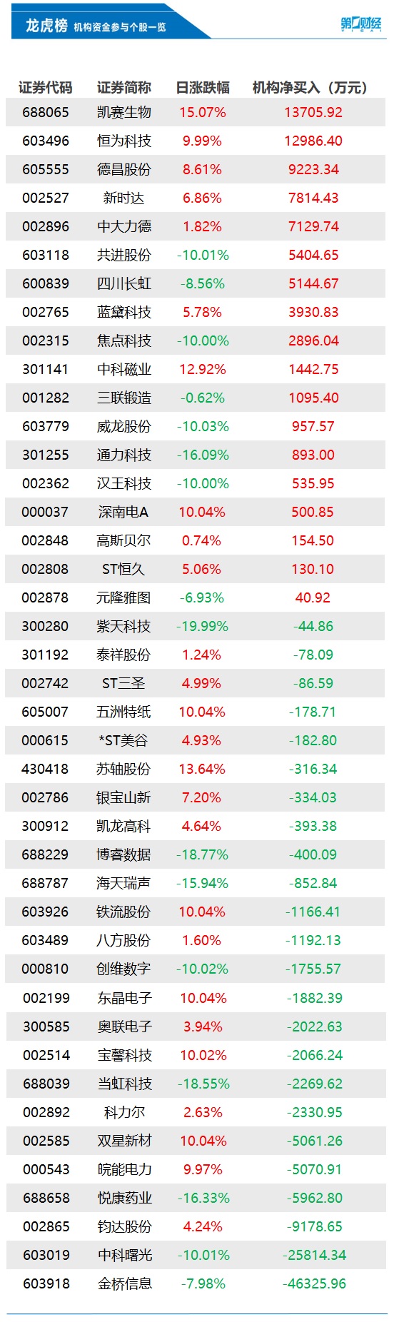 6月26日龙虎榜中,共42只个股出现了机构的身影,有18只股票呈现机构净买入,24只股票呈现机构净卖出。当天机构净买入前三的股票分别是凯赛生物、恒为科技、德昌股份;当天机构净卖出前三的股票分别是金桥信息、中科曙光、钧达股份。