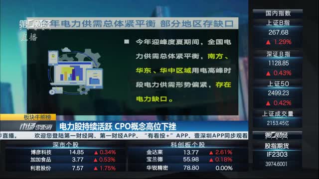 电力股继续活跃,深南电A3连板,桂东电力2连板,恒盛能源、豫能控股、建投能源等纷纷高开。AI方向最强风口,CPO概念股高位持续下挫,铭普光磁逼近跌停,光库科技、源杰科技跌超5%,太辰光、剑桥科技等纷纷下挫。