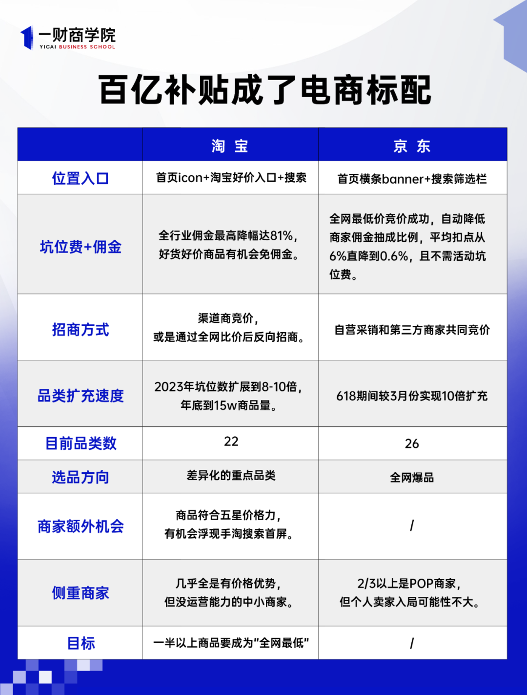 618期间,经一财商学院测算,京东百亿补贴的品类数量已达到26个,SKU数量也有了10倍扩充,远高于同期淘宝百亿补贴同品类的SKU数。据悉,淘宝百亿补贴将于2023年底实现8-10倍的坑位数扩充。