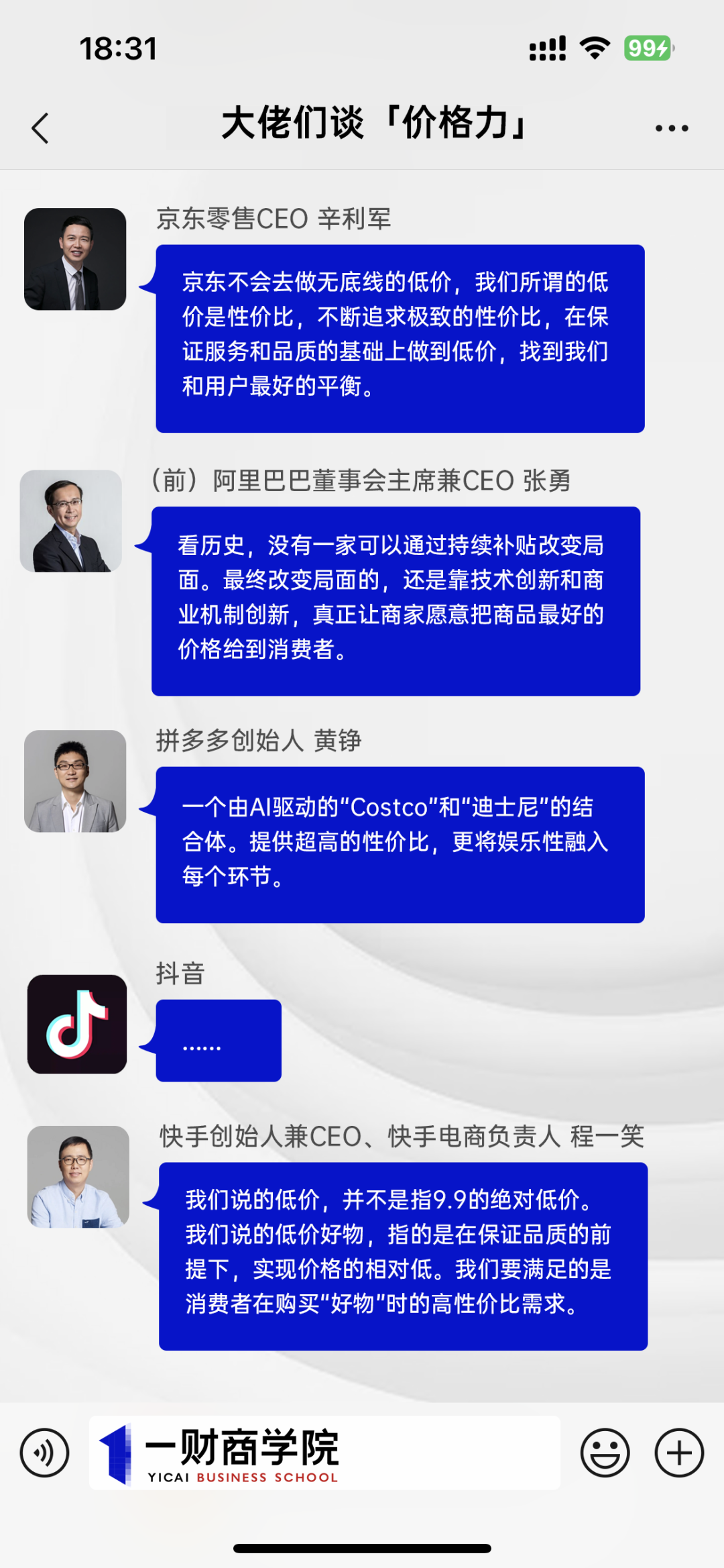 各个平台的关键角色们都在各种场合提到了“价格”。核心思想大同小异,都是价格力≠绝对低价,而是带着条件的“性价比”。