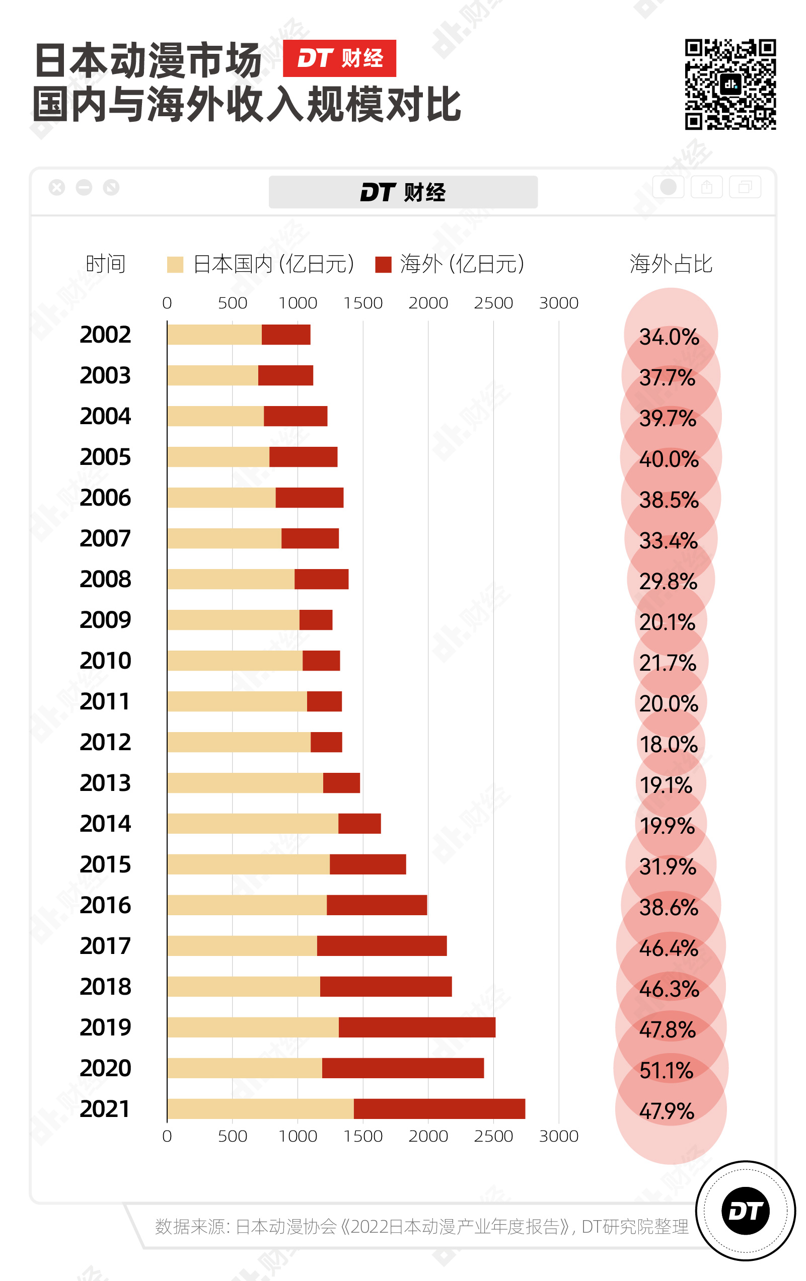 但网络限令随之而来,2006年,中国出台限制外国动画播放的政策。尽管2010年,内地电影市场开放,柯南剧场版系列开始进入电影院,让日本动画公司看到了新路线——没法在电视上播放,就到电影上。但都票房平平。日本动画协会发布的《2022日本动漫产业年度报告》显示,日本动漫市场海外收入从这一年开始下跌,一直到2016年,《你的名字》大火,才重新掀起新一轮日本动画大热潮。