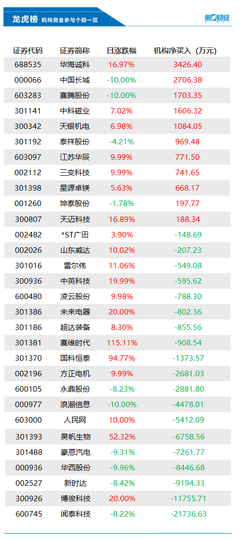 7月12日龙虎榜中,共30只个股出现了机构的身影,有11只股票呈现机构净买入,19只股票呈现机构净卖出。当天机构净买入前三的股票分别是华海诚科、中国长城、赛腾股份;当天机构净卖出前三的股票分别是闻泰科技、博俊科技、新时达。
