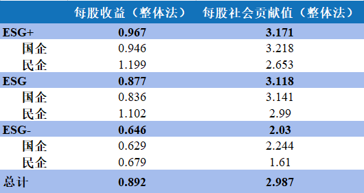 一是涵盖ESG等社会影响的每股社会贡献值能够更好地衡量企业价值,拓展了企业价值的内涵,丰富中国特色估值体系的衡量维度。每股社会贡献值[2],一方面涵盖了净利润、税收、职工薪酬、利息支出、捐赠以及出售碳排放权的收入等正面影响,另一方面也包括在环境、社会以及公司治理方面遭受的处罚、购买碳排放权的支出等。以中证800成份股为例,根据中证ESG评分由高到低分为ESG+、ESG、ESG-三档,可以看到,相对于传统的基本面计算的每股收益,从ESG视角丰富的每股社会贡献值明显增加,而且呈现出明显分层关系,ESG+每股社会贡献值为3.17,而ESG-为2.03。而且无论企业性质是国企还是民企,都可以看到企业每股社会贡献值显著高于每股收益,表明我国企业在创造经济价值的同时,对社会价值的贡献,有利于丰富中国特色估值体系。