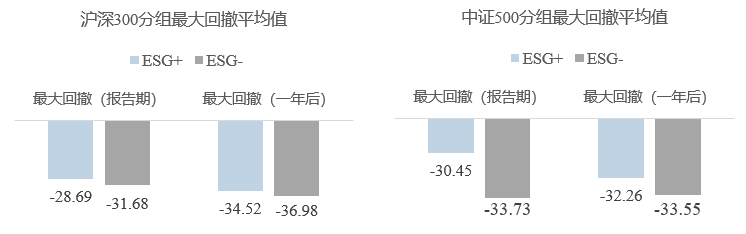 三是ESG通过风控机制提高上市公司应对风险的韧性,降低公司系统性与非系统性风险水平,提升企业经营稳健性。ESG表现优异的公司通常内部都有较好的风控机制,在受到市场冲击时降低对企业的影响。例如,能源利用效率高的公司受到能源价格变化的冲击比利用效率低的公司影响更小。因此,ESG表现优异的公司往往表现出较低的系统性风险。基于2021-2022年中证ESG评价数据,对沪深300和中证500样本股分组检验,相比低评分组,ESG高评分组的β值更低,说明ESG评分较高的公司相对于市场风险水平更低。