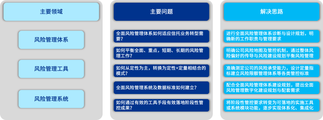 为配套新分类下的信托公司业务转型发展,信托公司在全面风险管理体系、工具和系统上均需进行变革,其面临的主要问题与相关解决思路如下所示: