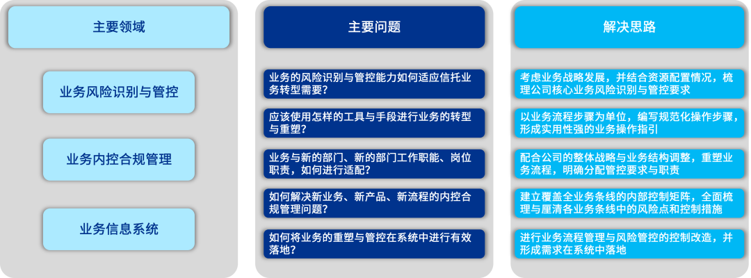根据三分类新规,信托公司应当以信托目的、信托成立方式、信托财产管理内容为分类维度,将信托业务分为资产服务信托、资产管理信托、公益慈善信托三大类共25个业务品种,为配套三分类新规要求,信托公司业务流程的风险识别与管控、内控合规管理、信息系统需同步进行变革,其面临的主要问题与相关解决思路如下所示: