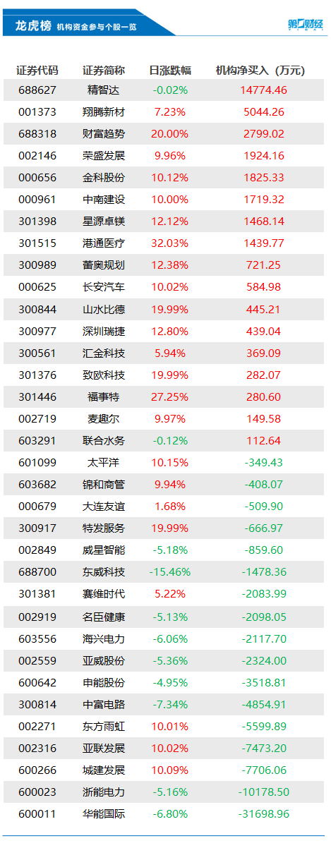 盘后数据显示,7月25日龙虎榜中,共34只个股出现了机构的身影,有17只股票呈现机构净买入,17只股票呈现机构净卖出。当天机构净买入前三的股票分别是精智达、翔腾新材、财富趋势。当天机构净卖出前三的股票分别是华能国际、浙能电力、城建发展。