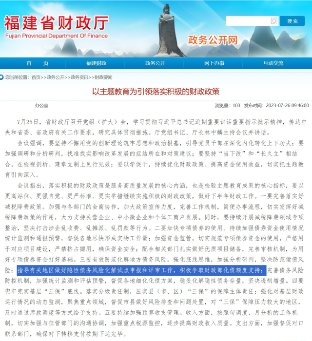 7月25日,福建省财政厅召开了党组(扩大)会,其中在谈到下半年当地财政工作部署时,一大要点是有效防范化解地方债务风险。其中包括指导有关地区做好隐性债务风险化解试点申报和评审工作,积极争取财政部化债额度支持。不过,目前这一内容已经从《以主题教育为引领落实积极的财政政策》一文中删除。
