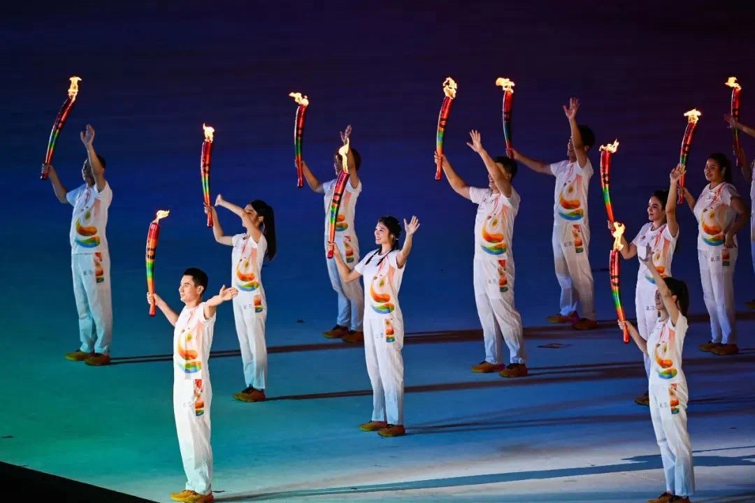 郎铮面带阳光自信的微笑,一手擎着火炬,一手随着音乐的律动挥舞摆动着,彰显出朝气蓬勃的精神面貌与活力四射的青春风采。接着,“太阳神鸟”图案火炬盘徐徐升起,31名火炬手围绕着火炬盘逐渐靠拢,双手举托着手中的火炬向前,一同指向火炬盘。烟火沿着火炬盘的轮廓喷发而出,形成一圈夺目的光芒,主火炬圣火熊熊燃起。