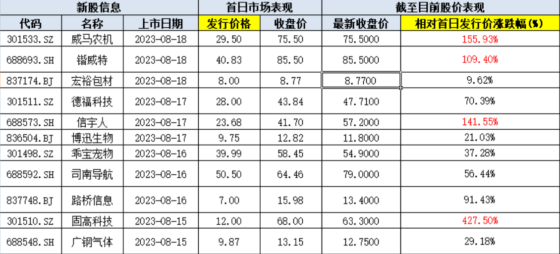11只新股中,创业板、科创板各4只,北交所3只。固高科技(301510.SZ)、威马农机(301533.SZ)、锴威特(688693.SH)和信宇人(688573.SH)4只新股首日收盘涨幅超过100%。其中,固高科技大幅收涨427.5%,这也是年内首次出现单周4只新股首日翻番的行情,资金炒作热情可见一斑。