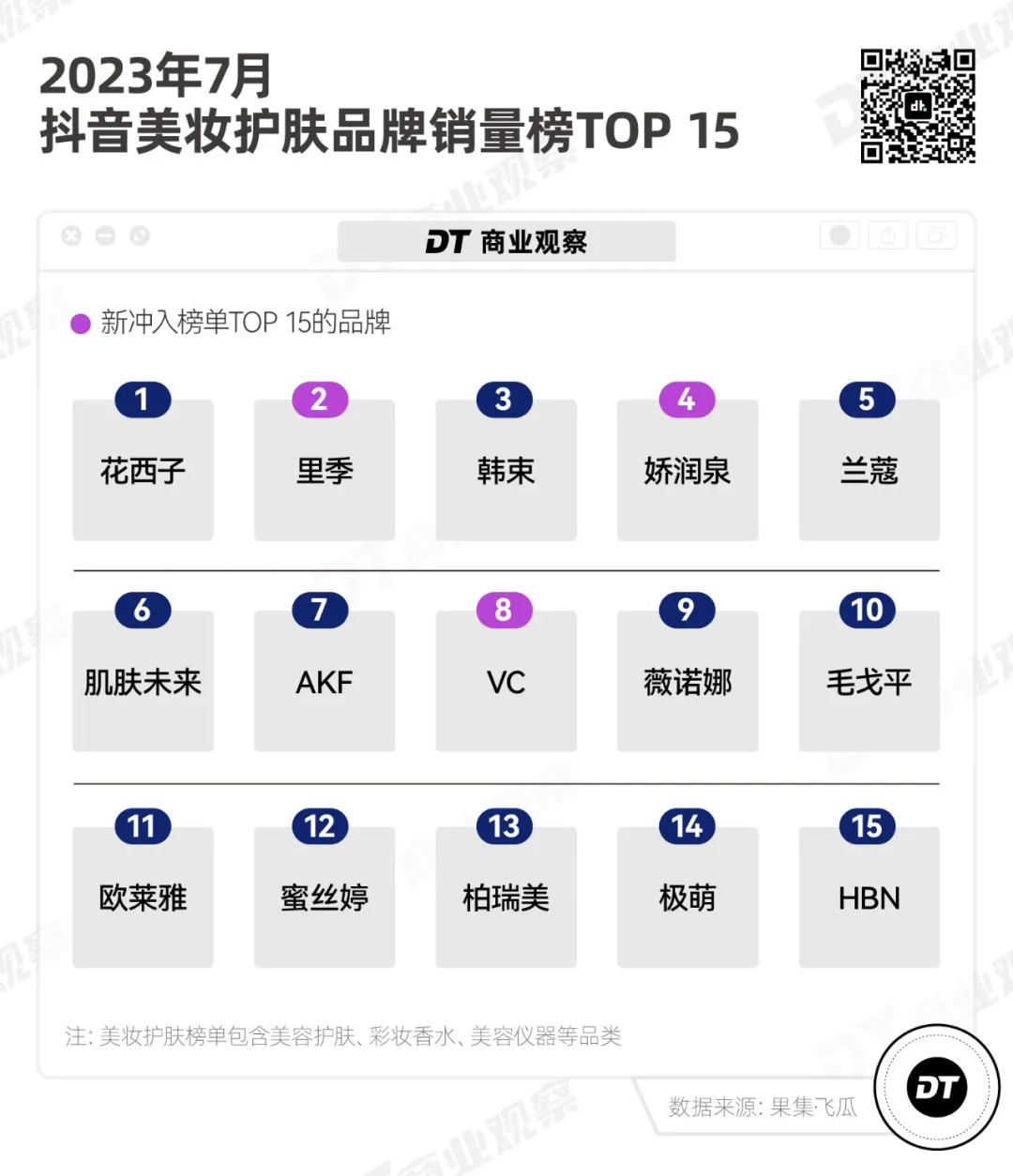在7月冲进抖音美妆月榜前十的里季、娇润泉和VC,是近三个月来首次上榜前十的生面孔。