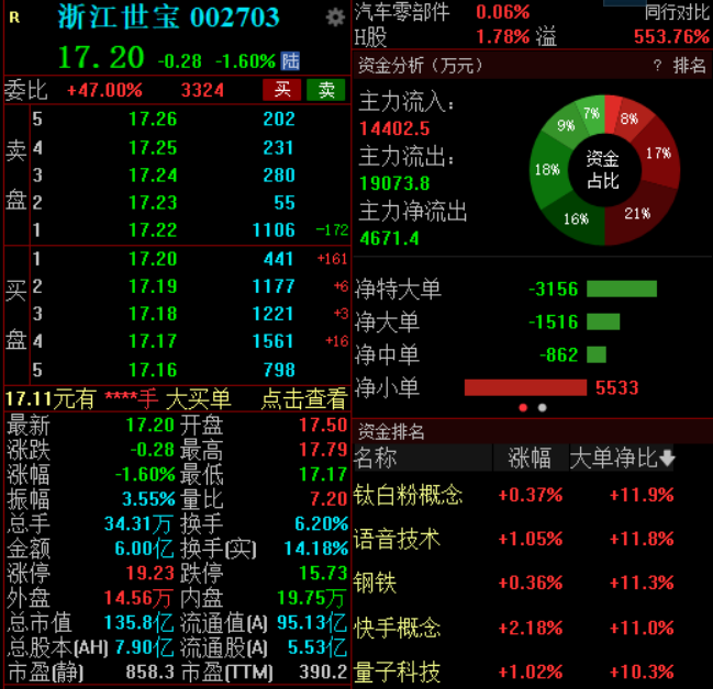 8月21日,浙江世宝高开低走,截至发稿,该股跌超1%,报17.20元,换手率6.20%。
