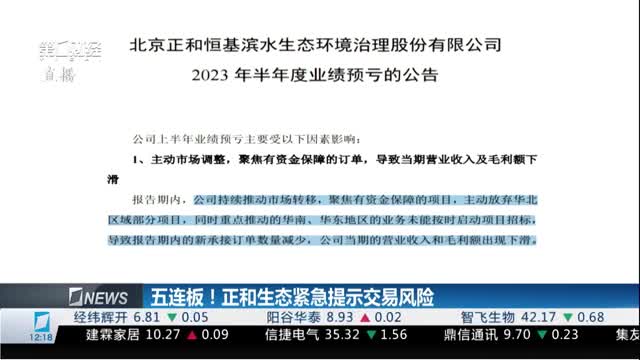 正和生态昨天上演“地天板”行情,最终收获5连板。截至收盘,公司股价报15.19元/股,换手率为58.49%,振幅达19.99%,全天成交6.68亿元,近5日累计上涨61.08%。昨天晚间,正和生态披露交易风险提示公告。今天早盘,公司股价出现回调。截至午间收盘,下跌2.17%。