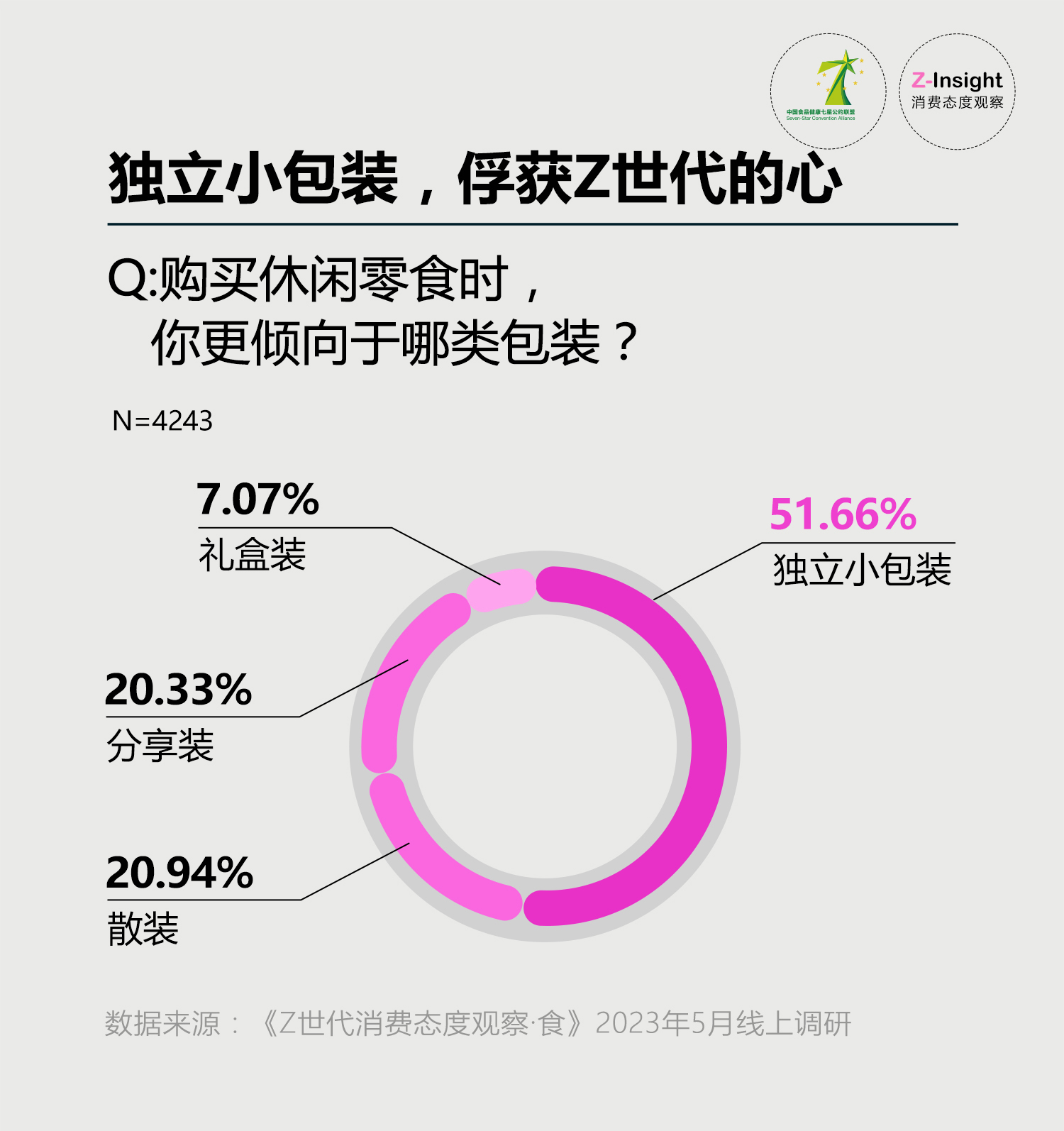 调查结果也显示,超过一半(51.66%)的Z世代消费者更倾向于选择独立小包装的休闲零食,20.33%和20.94%的Z世代选择分享装和散装。独立小包装不仅满足了Z世代们快节奏生活的需求,也使得他们能够尝试不同口味和品种,满足他们对于多样化味觉体验的需求。