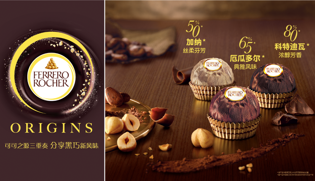 费列罗Rocher Origins,由3款由不同产地、不同浓度可可制成巧克力外层,分别是来自“可可之乡”加纳、50%浓度的可可;来自厄瓜多尔、65%浓度的可可;来自“可可王国”科特迪瓦、80%浓度的可可。