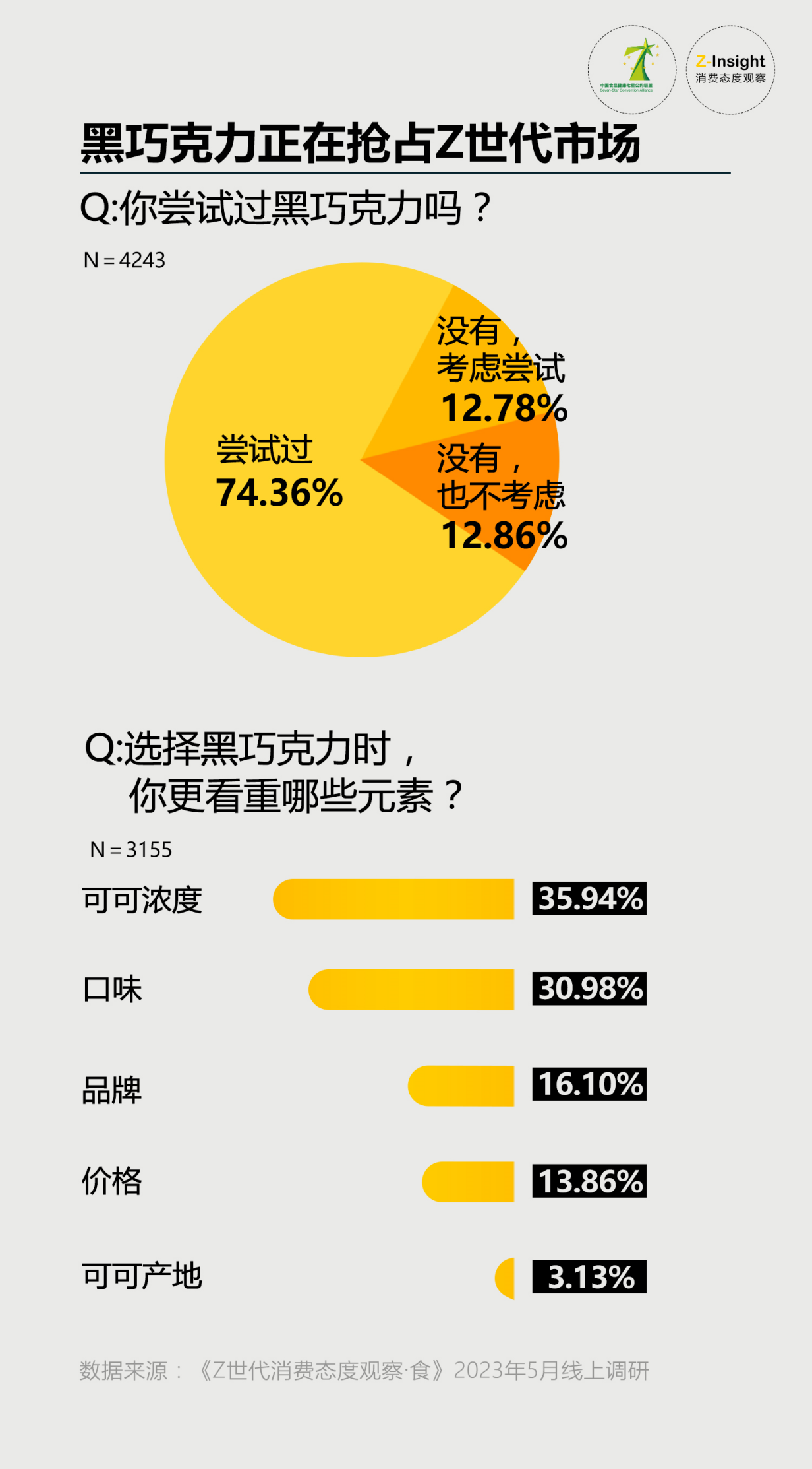 第一财经联合“中国食品健康七星联盟”共同发起的《Z世代消费态度观察·食》问卷调查结果显示,超过7成的Z世代尝试过黑巧克力。从选择传统巧克力和黑巧克力的Z世代数量来看,更倾向选择黑巧克力的Z世代成员占比远远超过了选择主打甜味的传统巧克力的人数,选择黑巧的人数达到了传统巧克力的两倍。