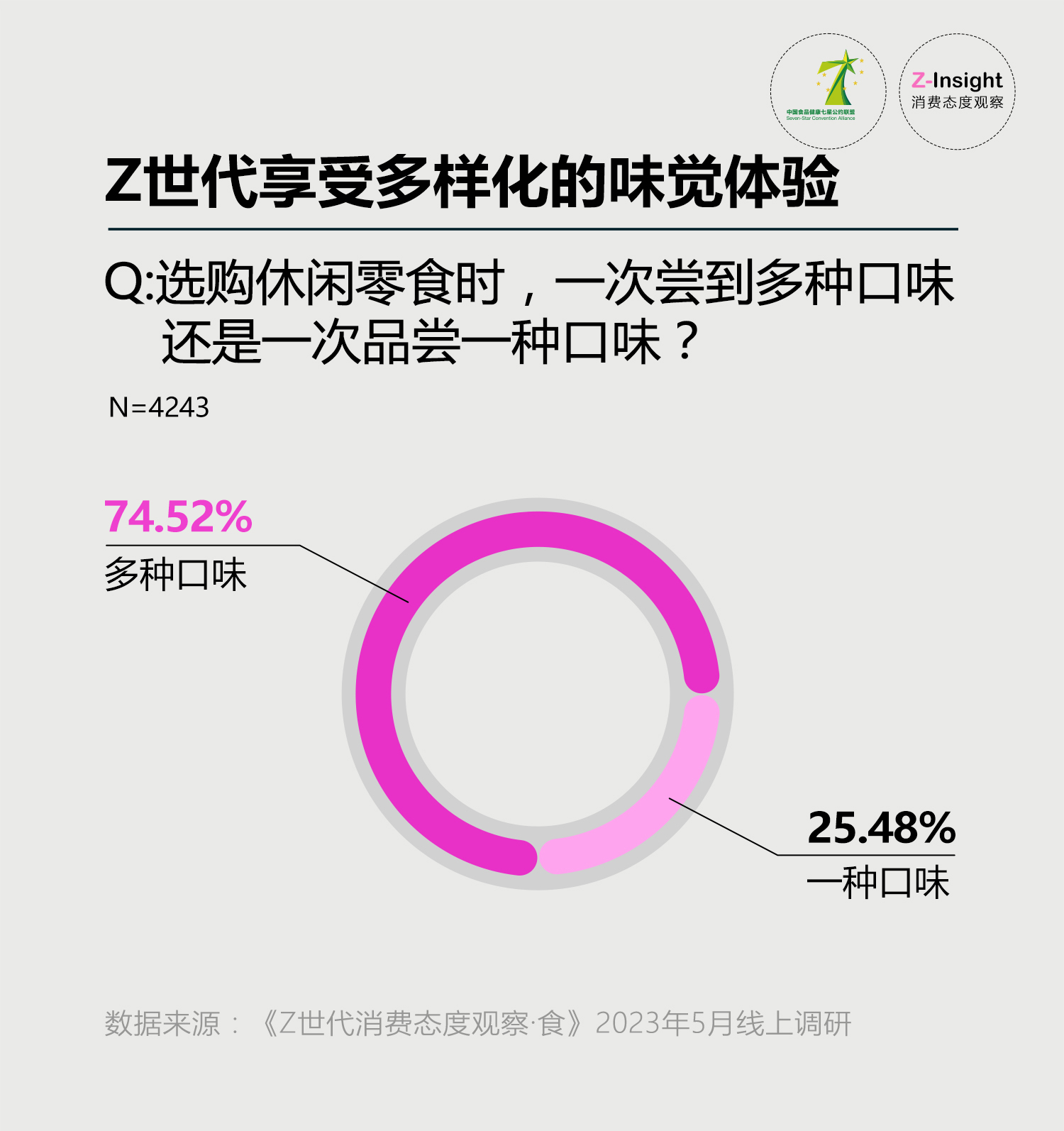 这一消费需求,与问卷调查结果一致。调查显示,74.52%的Z世代在选购休闲零食时,更倾向于一次尝到多种口味。