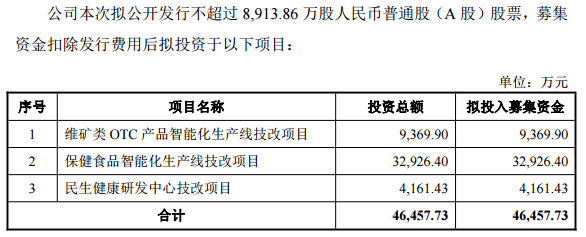 民生健康表示,公司此次拟公开发行不超过8,913.86万股人民币普通股(A股)股票,募集资金扣除发行费用后拟投资于维矿类OTC产品智能化生产线技改项目、保健食品智能化生产线技改项目、民生健康研发中心技改项目。