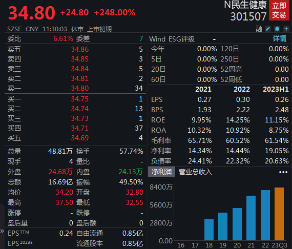 9月5日,民生健康首发上市登陆创业板,截至午盘,股价报34.80元,涨248%,成交额超16亿元,换手率57.74%,市值124.1亿元。