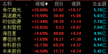 具体来看,TOPCon电池板块走强,帝尔激光、英诺激光、永和智控涨停,时创能源、海目星、帝科股份等跟涨。