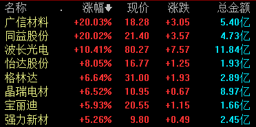 光刻胶板块拉升,广信材料、同益股份涨停,波长光电、格林达、怡达股份等涨超5%。