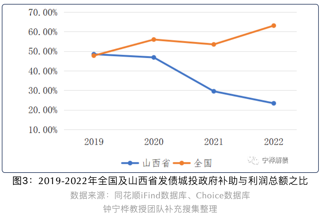 2019年到2022年,山西省城投公司政府补助收入占利润总额的比重从48.46%下降至23.37%,全国同期这一指标从47.73%上升至63.07%。