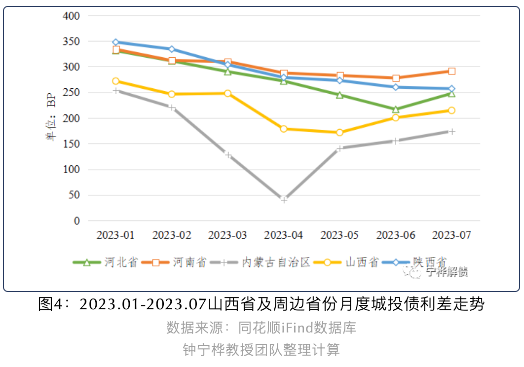 与相邻省份相比,今年以来山西省城投债利差总体处于中等偏下水平,近期出现上升趋势。