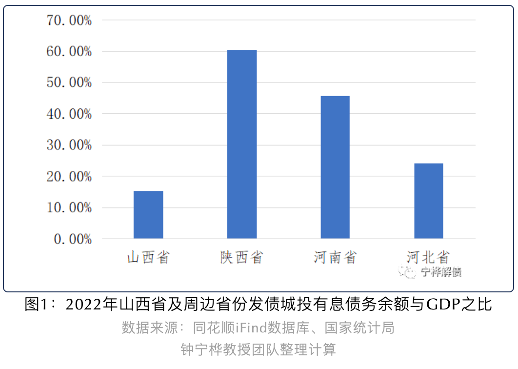 截至2022年,山西省发债城投的有息债务余额接近4000亿元,约为3944亿元,位列全国第二十四。从相对规模来看,山西省发债城投的有息债务余额与地区GDP之比约为15.38%,低于周边省份。
